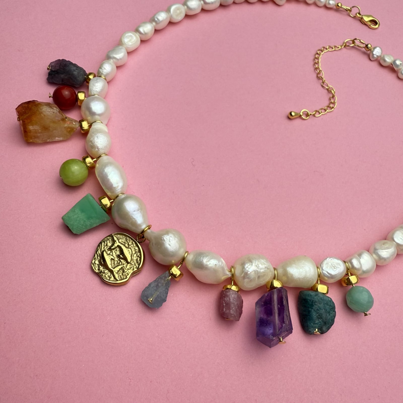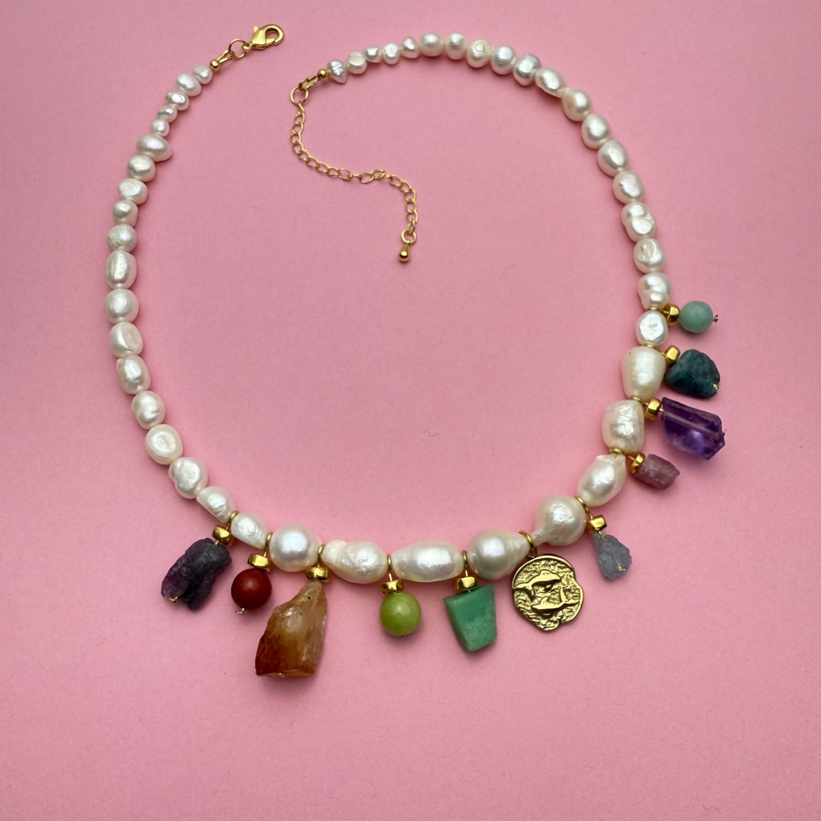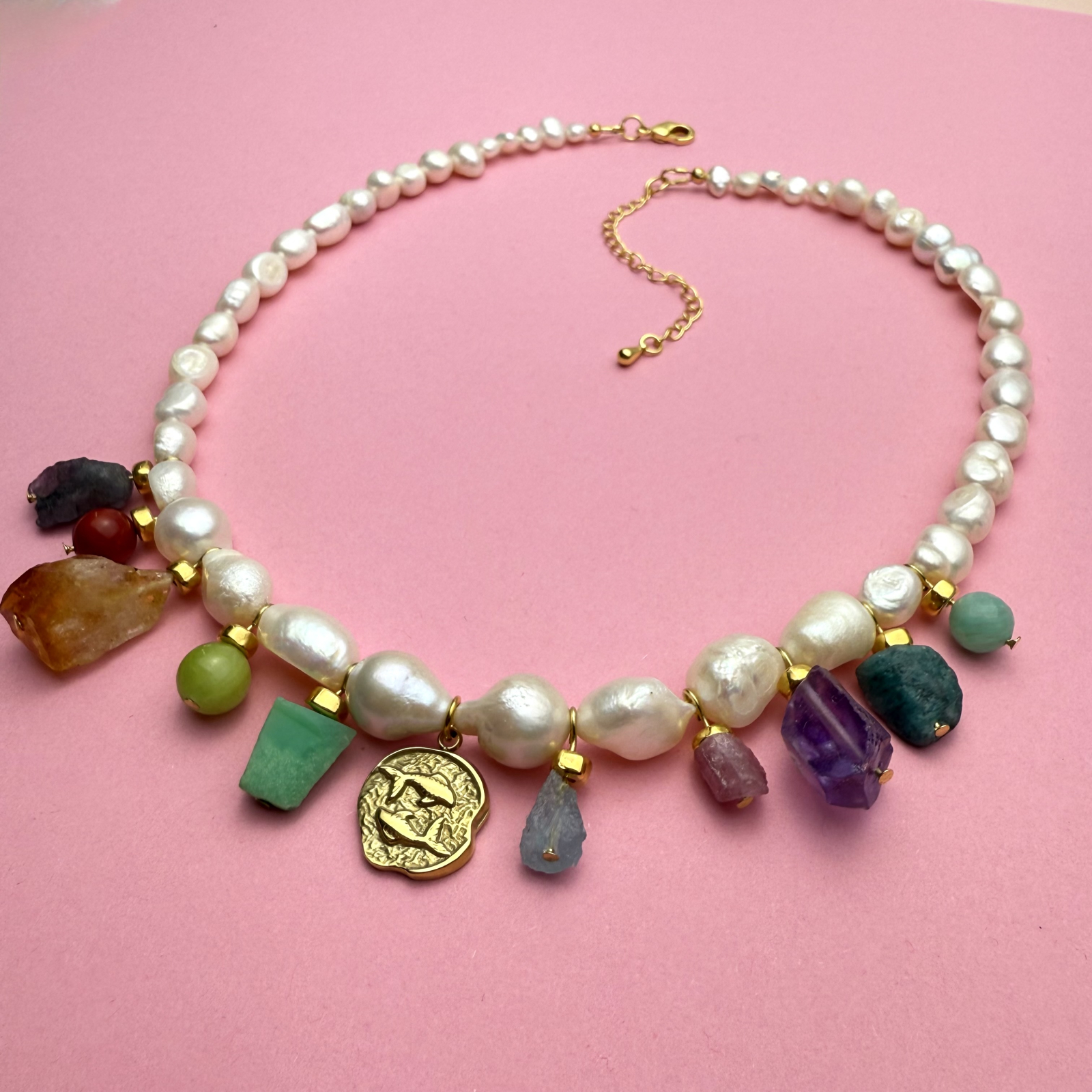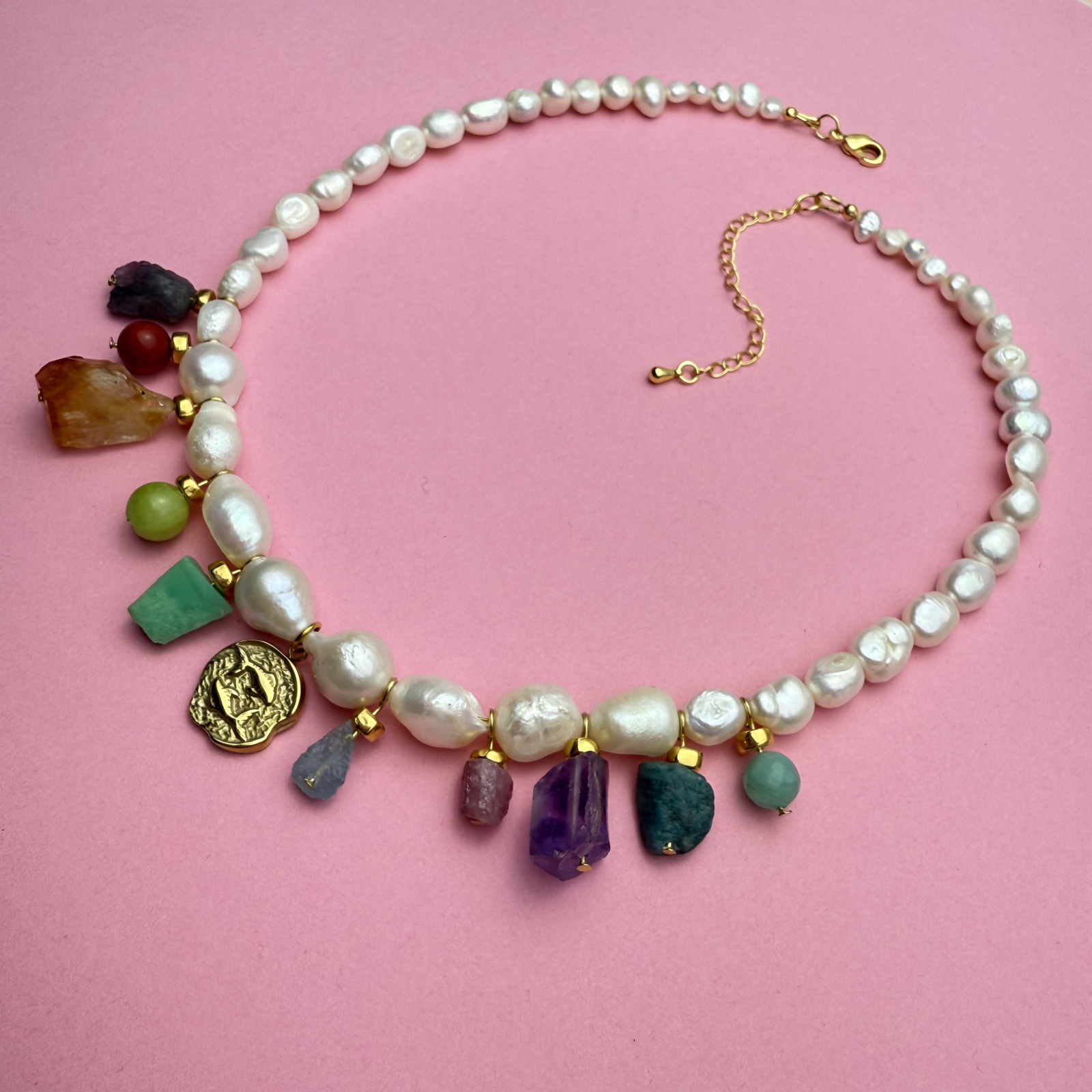Realizat manual din perle naturale baroque și pietre semiprețioase cu energii vibrante, fiecare colier poartă o poveste unică — despre echilibru, rafinament și autenticitate.