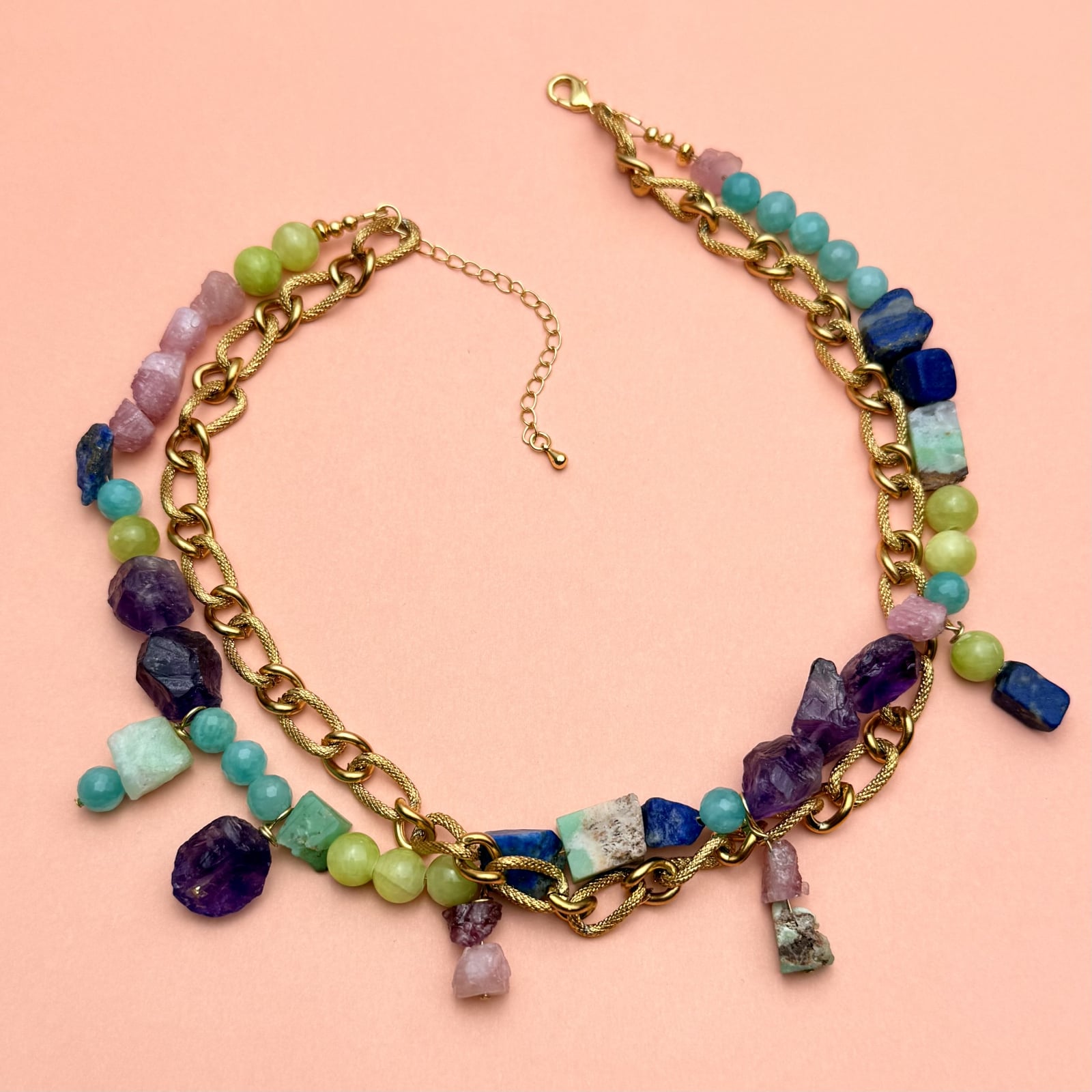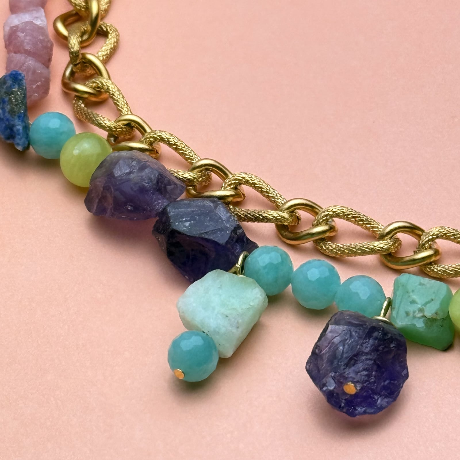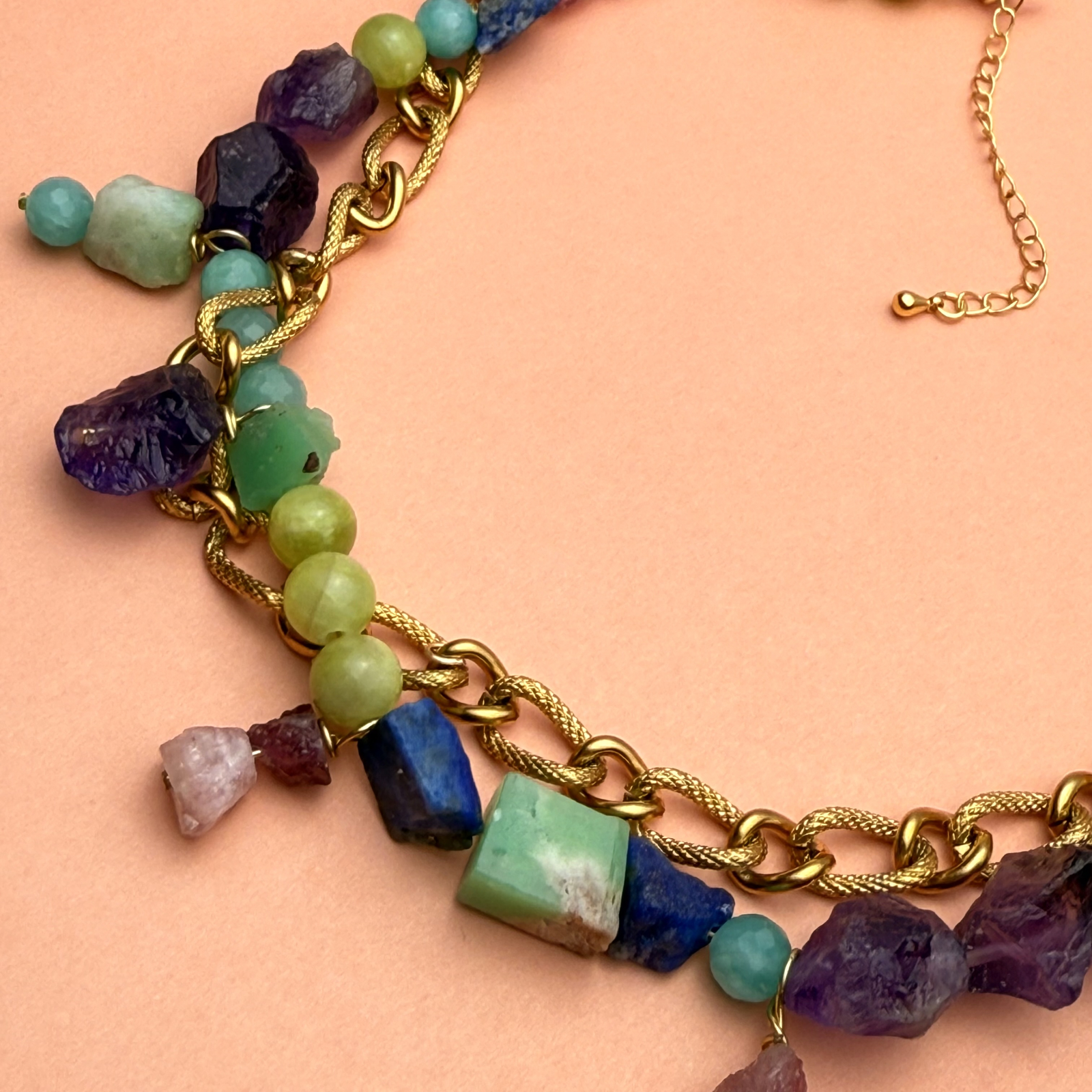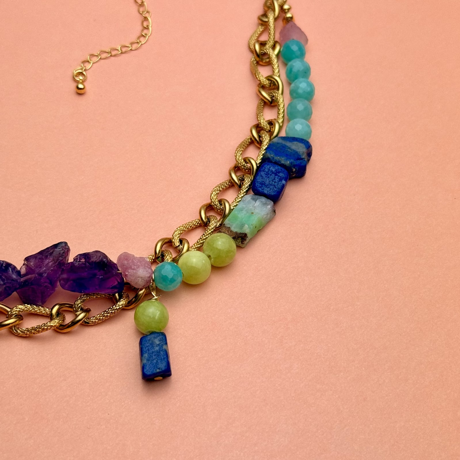 Materiale: pietre naturale brute (lapis lazuli, amazonit, ametist, turmalină, jad, crisopraz)