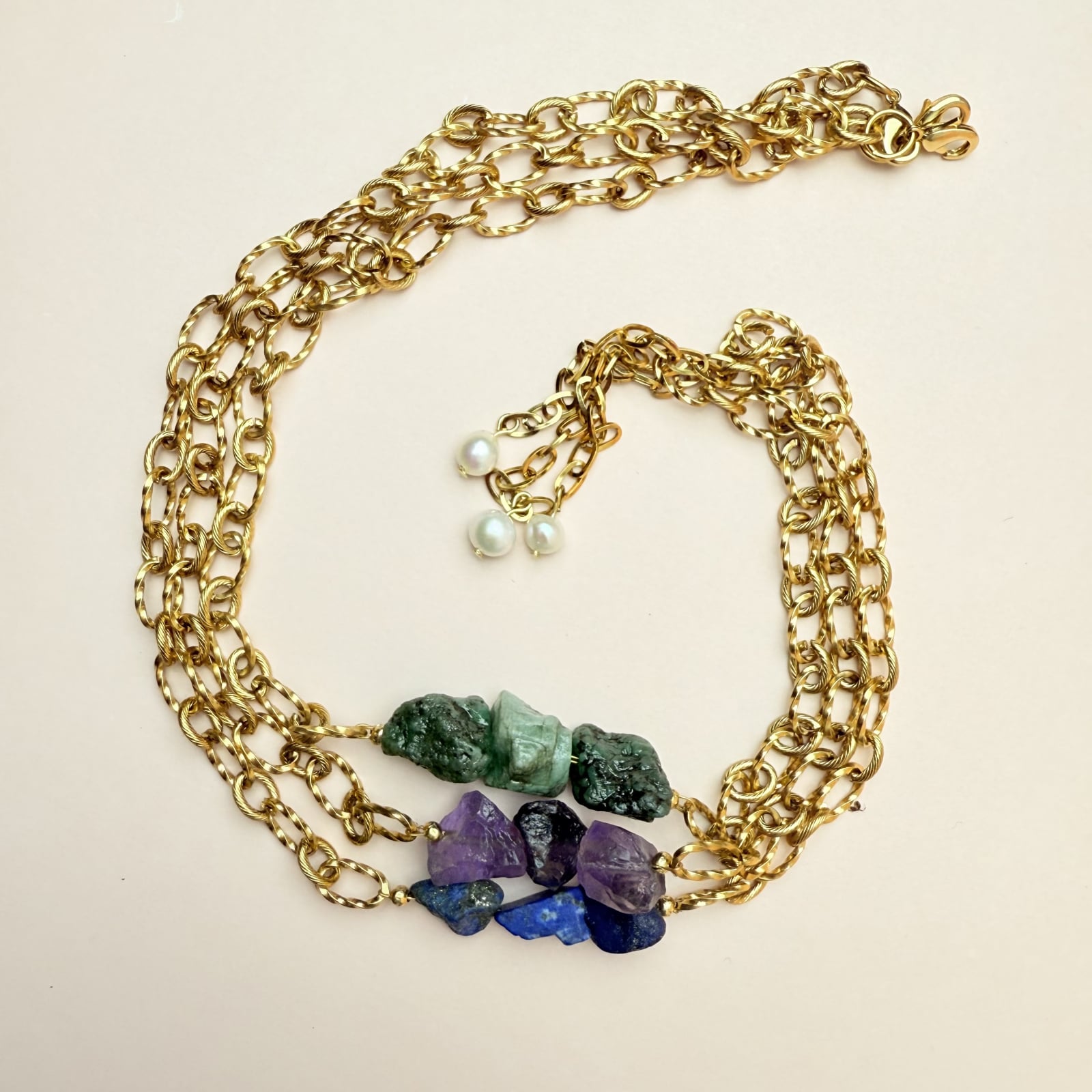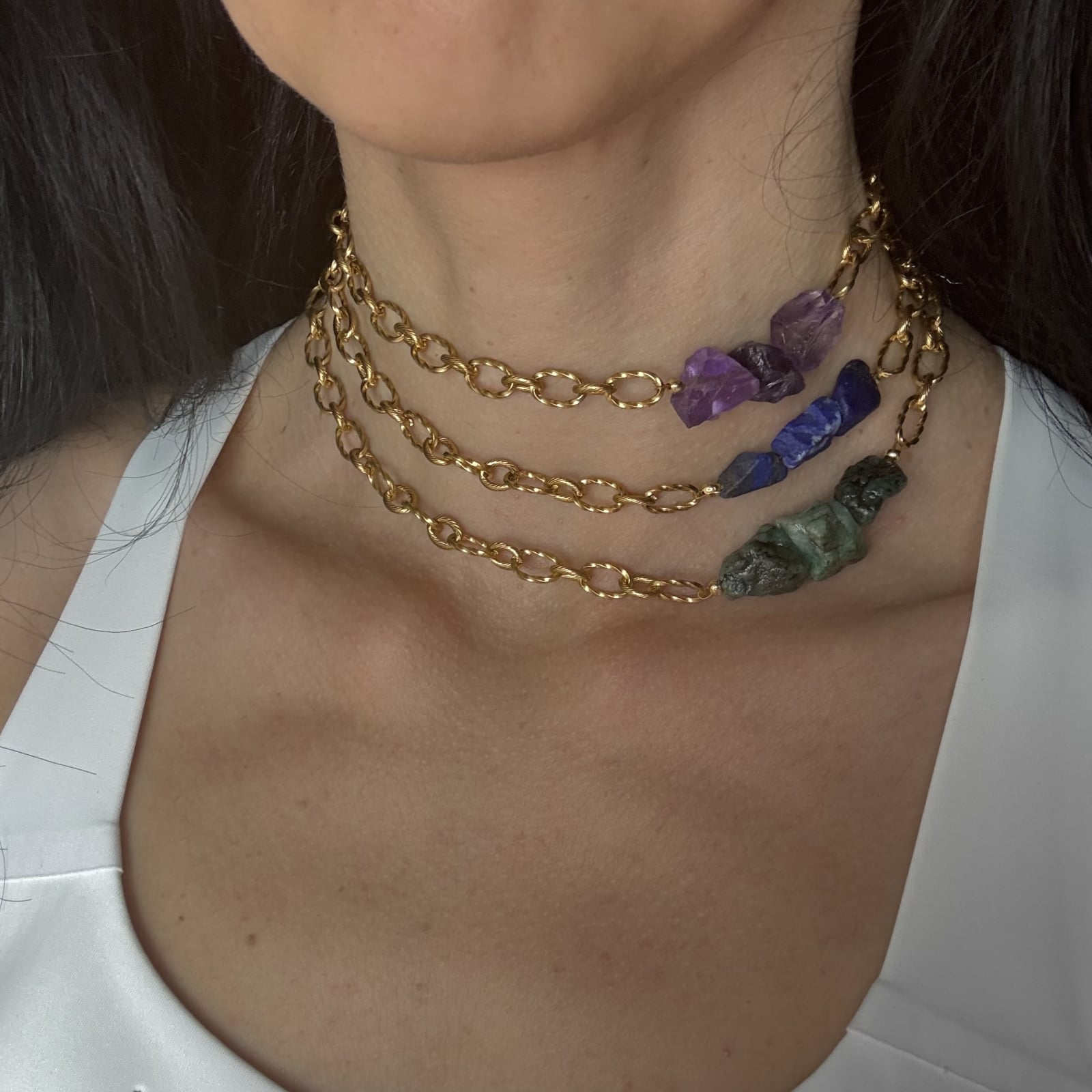Colierul Lapis Lazuli este o bijuterie handmade realizată din pietre brute de lapis lazuli și lanț din oțel inoxidabil placat cu aur.